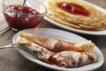 Thin pancakes are called crepes (say crapes), which is a French word. They are rolled or folded with a yummy filling inside. ©Jupiter Images