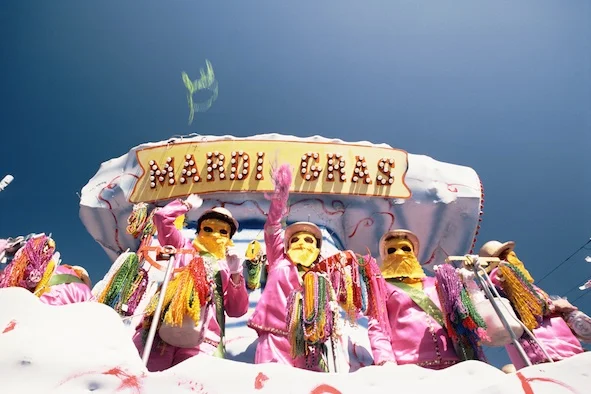 In the city of New Orleans in the USA, there is a famous parade called Mardi Gras, and people travel great distances to join in the fun. People wear very fancy masks, and the shops are full of beautiful masks for sale. There is a huge parade with lots of floats. People wearing masks and fancy costumes ride in the floats. They throw necklaces made of big beads into the crowd. It is good luck to catch one.